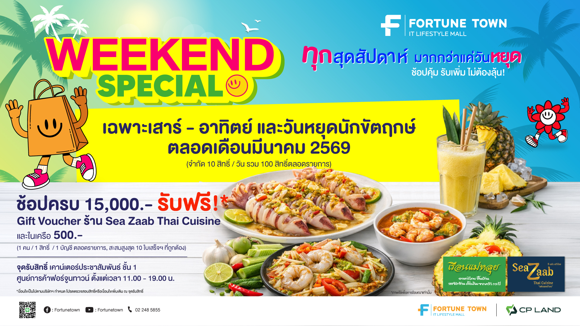 เงื่อนไข Weekend Special สะสมใบเสร็จต้องเป็นใบเสร็จที่ออกจากเครื่องแคชเชียร์ หรือใบเสร็จเต็มรูปแบบเท่านั้น ไม่รวมใบเสร็จเขียนมือ, ใบเสร็จ Reprint, ใบเสร็จสำเนา/Copy, ใบวางบิล, ใบ Preview รายการ ทุกกรณี จากร้านค้าที่ร่วมรายการภายในศูนย์การค้าฟอร์จูนทาวน์ ภายในวันเดียวกัน รวมมูลค่า 15,000 บาท (ตามยอดชำระจริง) รับฟรี Gift Voucher ร้าน ร้านอาหาร Sea Zaab Thai Cuisine และในเครือ มูลค่า 500 บาท จำกัด 10 สิทธิ์/วัน รวมจำนวน 100 สิทธิ์ตลอดรายการ สามารถสะสมใบเสร็จได้สูงสุด 10 ใบ และใบเสร็จรับเงินใช้ได้วันต่อวันเท่านั้น สามารถใช้สิทธิ์ได้ 1 คน/1 สิทธิ์/1 บัญชี และสามารถได้รับสิทธิ์สูงสุด 1 สิทธิ์ ตลอดรายการ สามารถร่วมกิจกรรมได้ตั้งแต่วันที่ 1 มีนาคม […]