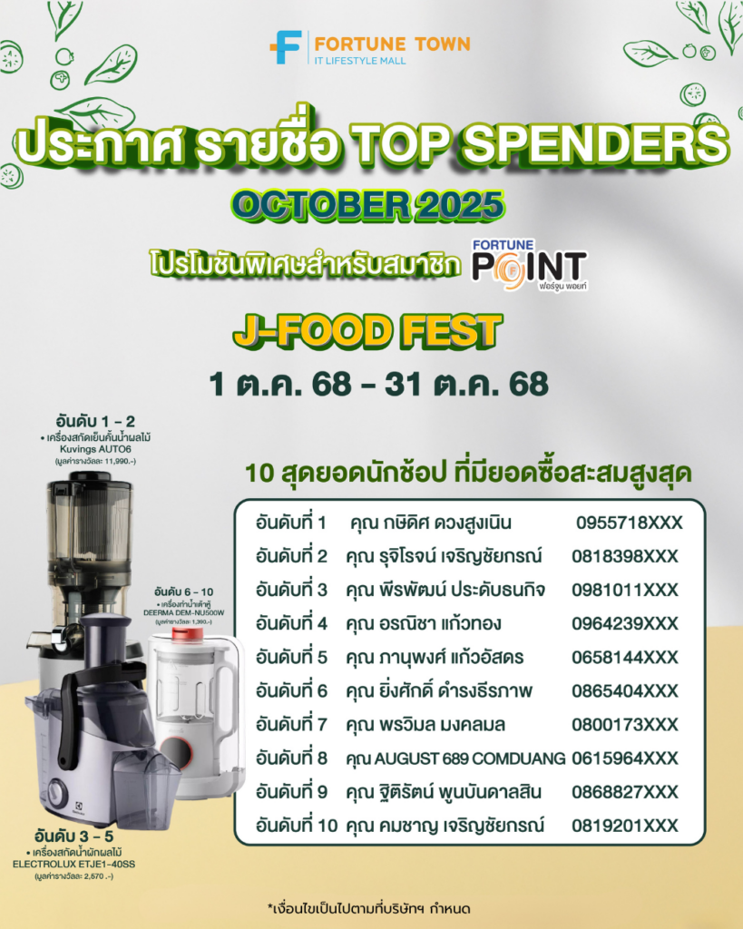 1. ผู้โชคดีที่ได้รับรางวัลต้องนำหลักฐานบัตรประจำตัวประชาชน พร้อมรับรองสำเนาถูกต้อง จำนวน 1 ชุดมาเป็นหลักฐานในการขอรับรางวัลด้วยตัวเอง ที่ ศูนย์การค้าฟอร์จูนทาวน์ ชั้น 10 ตั้งแต่วันที่ 10 พฤศจิกายน 2568 ถึง วันที่ 19 ธันวาคม 2568 ณ ชั้น 10 ศูนย์การค้าฟอร์จูนทาวน์ ในวันจันทร์ถึงวันศุกร์ เวลา 10.00 – 18.00 น. (ยกเว้นวันหยุดราชการ) เท่านั้น หากเลยกำหนดไม่ว่าด้วยเหตุผลใด ๆ ถือว่าท่านได้สละสิทธิ์การรับของรางวัลดังกล่าว